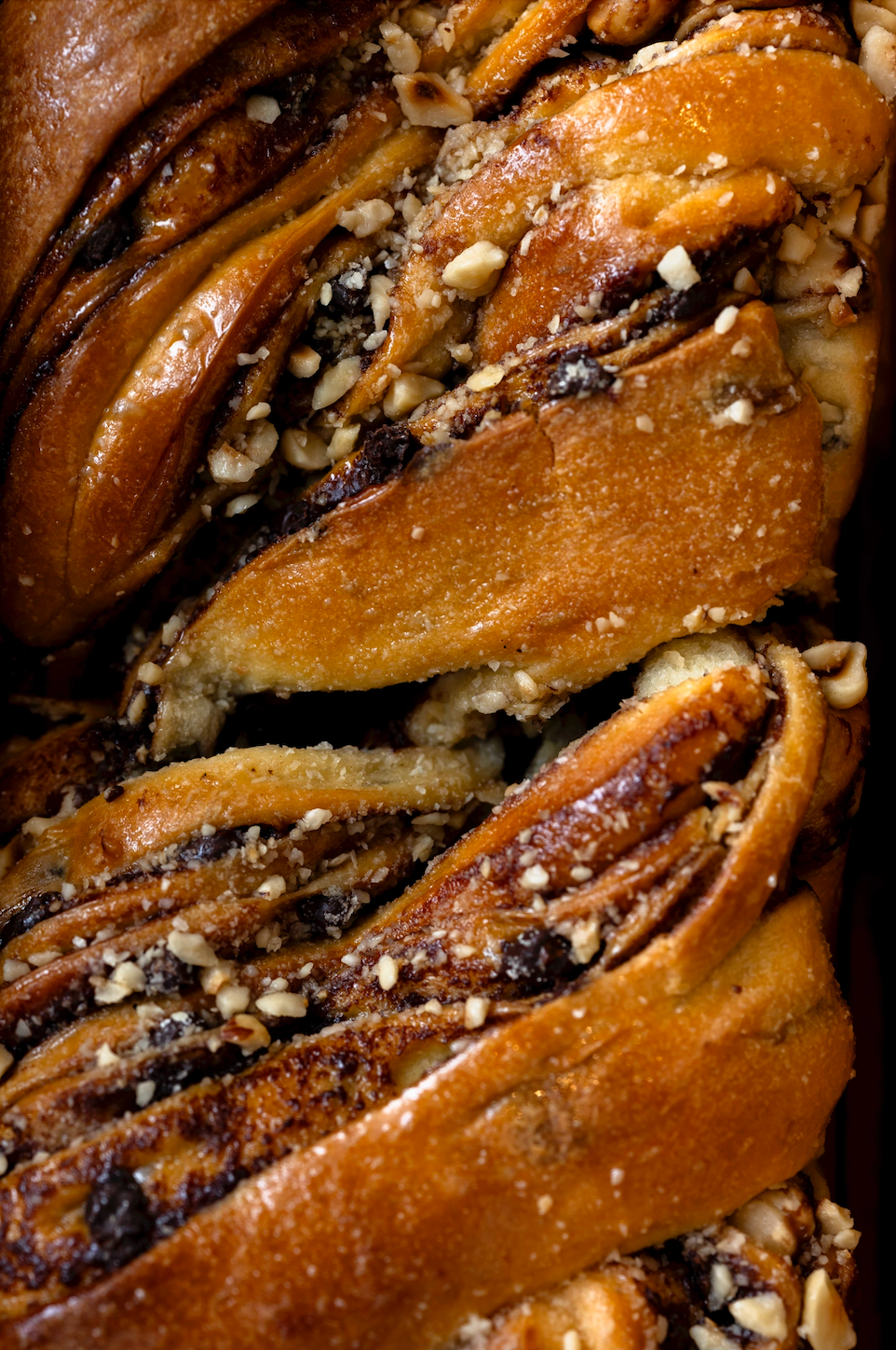 Brioche tressée au levain garnie de pâte à tartiner chocolat noisette bio, de pépites de chocolat et de noisettes.